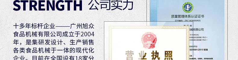 廣州旭眾食品機械有限公司是一家集科研開發,生產設計,營銷服務為一體的現代化生產企業。現代化生產車間,精湛制造技術,所產機械歷經市場重重考驗,不斷贏得海內外客戶的贊譽。