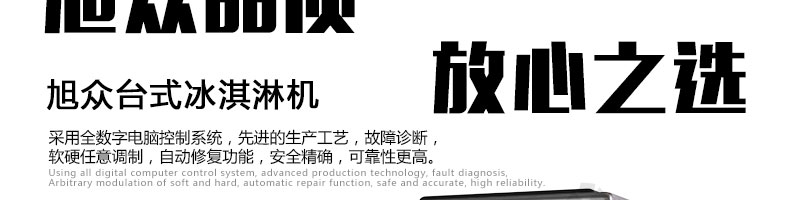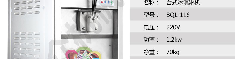 BQL-116臺式冰淇淋機,●選用國際名牌成熟制冷配套件和高效壓縮機,融合旭眾精湛工藝輔以嚴格的質量控制流程,使產品整體性能及品質得以全面提升。●采用全數字電腦控制系統,選用名牌優質電器元件,先進的生產工藝,故障診斷,軟硬任意調制,自動修復功能,安全精確,可靠性更高。●專業成熟制冷系統設計,選用世界名牌大功率專用壓縮機,大大縮短冰淇淋成型時間,相同時間內冰淇淋產量大幅度增加,使您生意火爆時依然得心應手,為您創造財富。●安全平穩的機械攪拌系統,噪音更低、振動更小,使整機運行性能達到國際先進水平。●確保進料溫度在0°C~35°C;環境溫度5°C~40°C勻可正常使用。