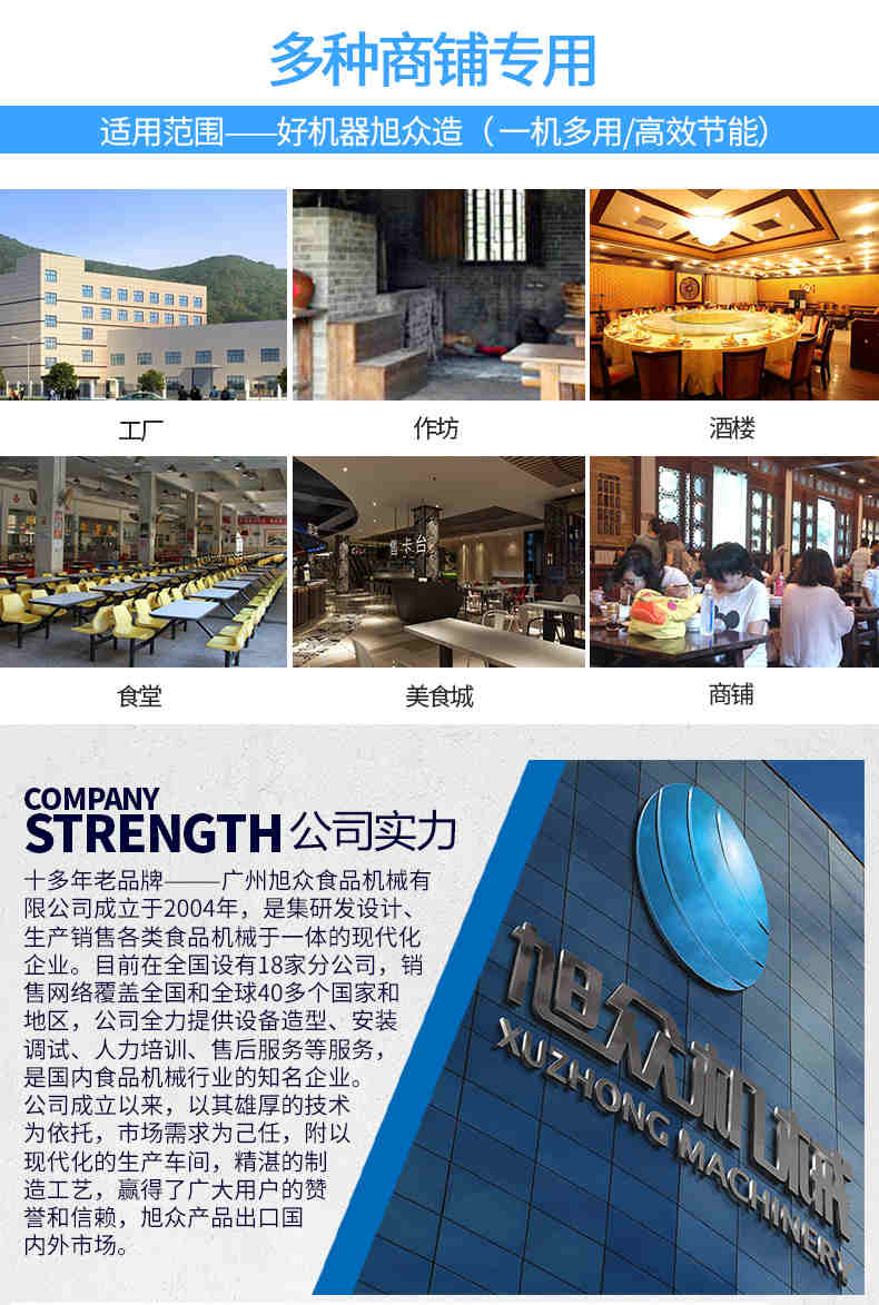 廣州旭眾食品機械有限公司是一家集科研開發,生產設計,營銷服務為一體的現代化生產企業。現代化生產車間,精湛制造技術,所產機械歷經市場重重考驗,不斷贏得海內外客戶的贊譽。