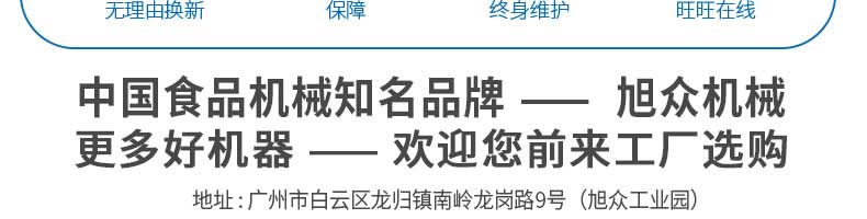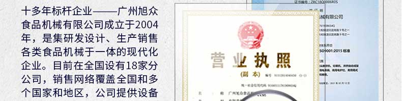廣州旭眾食品機械有限公司是一家集科研開發,生產設計,營銷服務為一體的現代化生產企業。現代化生產車間,精湛制造技術,所產機械歷經市場重重考驗,不斷贏得海內外客戶的贊譽。