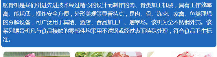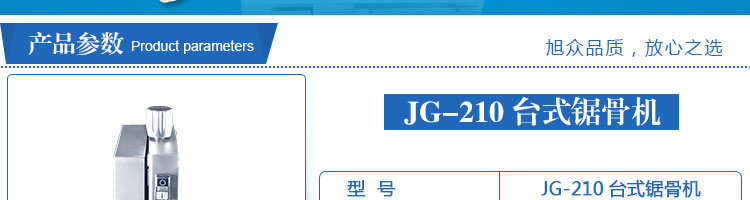 JG-210臺式鋸骨機,適用于各類骨頭,冷凍肉,帶魚骨,冰塊,冷凍魚的分割。采用全不銹鋼材料制作,具有工作效率高,操作安全的特點。廣泛適用于食品加工廠,屠宰場,肉類加工廠等