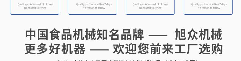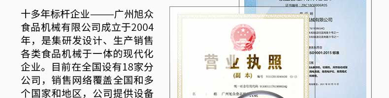 廣州旭眾食品機(jī)械有限公司是一家集科研開發(fā),生產(chǎn)設(shè)計,營銷服務(wù)為一體的現(xiàn)代化生產(chǎn)企業(yè)。現(xiàn)代化生產(chǎn)車間,精湛制造技術(shù),所產(chǎn)機(jī)械歷經(jīng)市場重重考驗,不斷贏得海內(nèi)外客戶的贊譽(yù)。