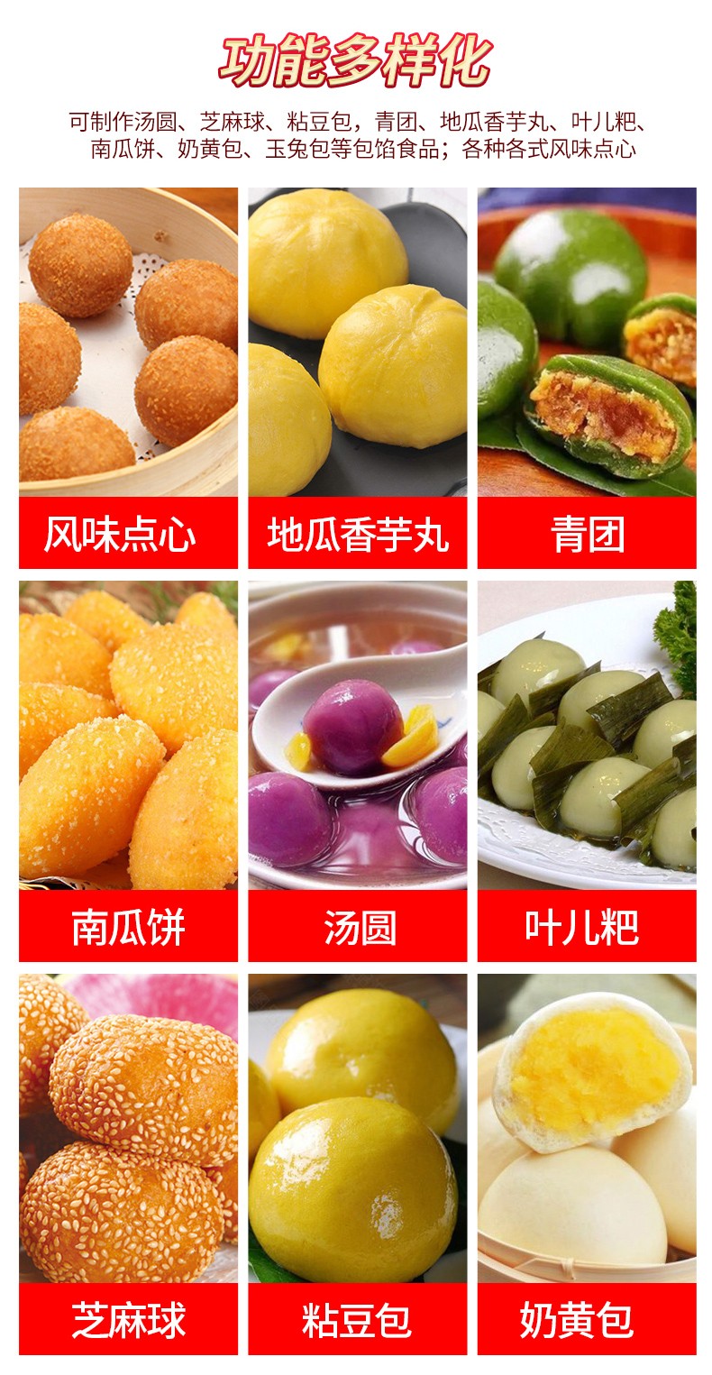 可依外皮及餡料的種類不同,可制作湯圓,芝麻球,豆沙包,南瓜餅、奶皇包、含餡饅頭、玉兔包等包餡食品;各種地方風味小吃及各式點心。如:東北的粘豆包,江浙滬的青團,東南部的地瓜丸,香芋丸;西南的葉兒粑等等。